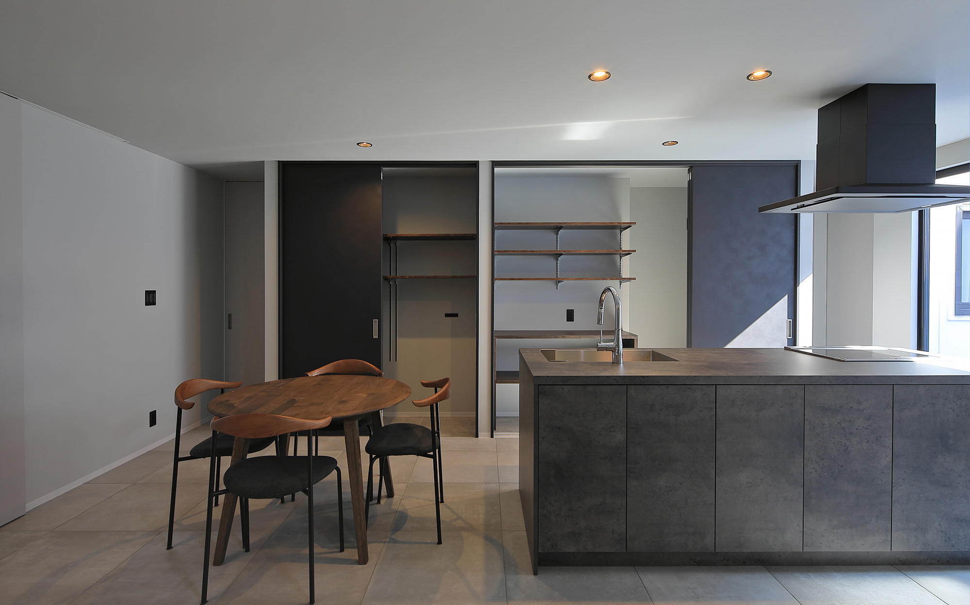 光とデザインが織りなす唯一無二の空間 土地の特性を最大限に活かした住まいの配置により 快適で魅力的な空間を実現しました。 南側には合計幅5.5mの大きな窓を設け、 建物と調和する縦格子を組み合わせることで 約22.5帖の広々LDKに柔らかな自然光を 取り入れる工夫が施されています。 また、鉄骨で仕上げたオリジナルデザインの 階段を採用し、階段室全体にデザインを重視した 設計を取り入れることで、住まい全体が 洗練された雰囲気になりました。